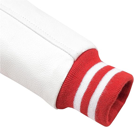 Design: Timeless letterman silhouette with contrast sleeves and ribbed cuffs